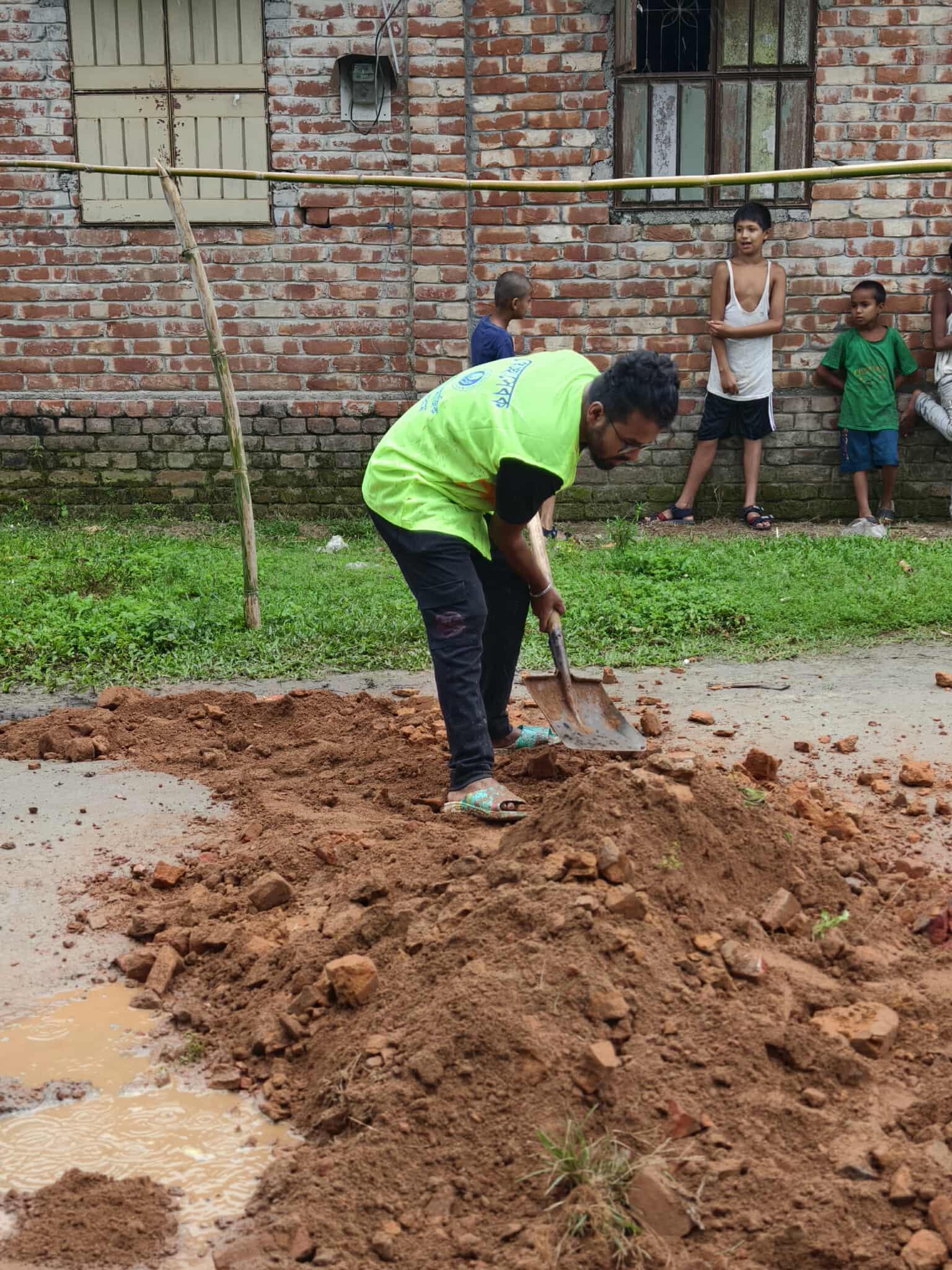 রাস্তা সংস্কারের কাজে হাসিমুখে অংশগ্রহণ করছেন আমাদের একজন স্বেচ্ছাসেবী।