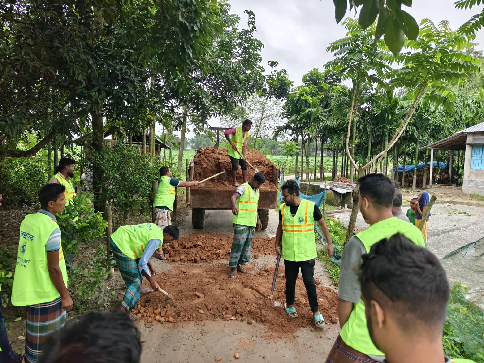 কেউ দেখছে রাস্তা সমানভাবে মাটি পড়েছে কিনা, কেউ আবার কোদাল আর দা হাতে নিয়ে জায়গা অনুযায়ী ঠিকঠাক হচ্ছে কিনা দেখছে। একসাথে দাঁড়িয়ে আলোচনা করছে—আরো কোথাও মাটি লাগবে কিনা, নাকি সমান হয়ে গেছে। সবার চোখে এক ধরনের তৃপ্তি আর দায়িত্ববোধ কাজ করছে, যেন গ্রামের মানুষের জন্য নিজের কাজটা সুন্দরভাবে শেষ করতে পারছে।